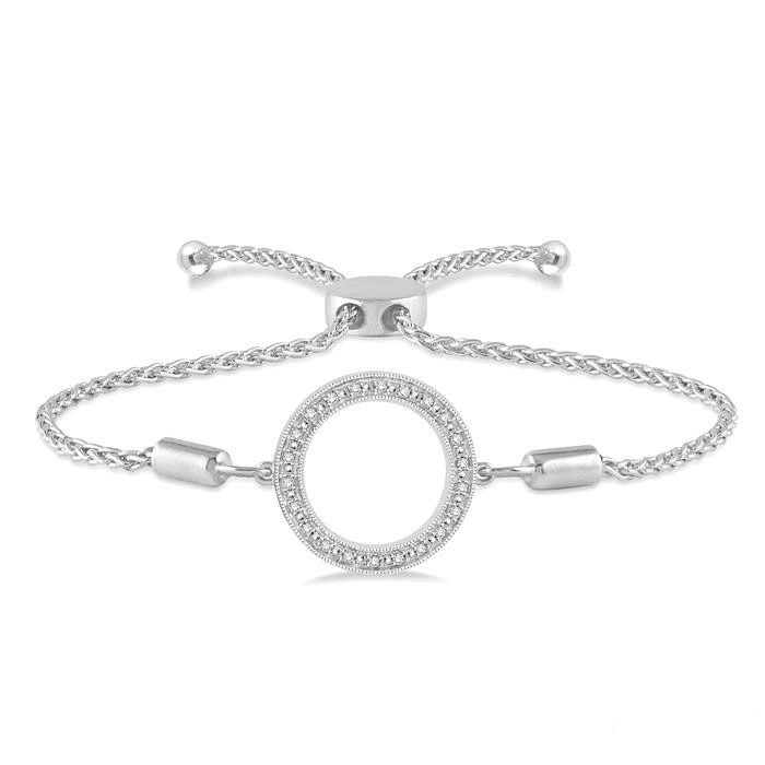 An attractive bracelet with diamonds adding the right amount of sparkle and elegance to it. It features a hollow cut circle in the center, which is adorned by 22 pave set round cut diamonds, offering a dazzling look to it. The circular centerpiece is attached to a lariat link chain with open ends and tiny ball supporters. A slide clasp with easy adjustability to fit different wrist sizes holds the lariat link chain together. The pretty bracelet is styled in sterling silver. The total diamond weight is 1/10 Ctw.
