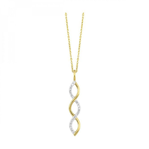 Reminiscent of Christmas garland, this beautifully designed diamond and gold swirl pendant is sure to add that extra festive beauty to your life. Featuring 1/8 ctw of diamonds, it offers an impressive sparkle at an affordable price. Plus, with its elongated and graceful design, this pendant complements the body’s natural flow, making it a perfect addition to any elegant outfit. Whether for a holiday celebration or as a timeless accessory, this piece effortlessly combines sophistication with festive charm.