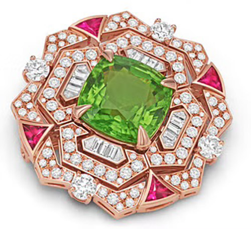 As seen here, the brooch is set with luxurious diamonds, rubies, and of course a large peridot as the centerpiece. A$AP wore it loudly and proudly above the heart at the Met Gala and it truly drew some serious attention.