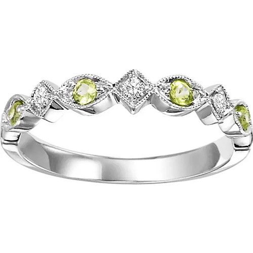 Peridot, while not the traditional choice for a wedding band, is a stunning and unique option for those seeking something more personal. This 10-karat white gold luxurious diamond and peridot ring is excellent for unique wedding bands, anniversary gifts, or engagement jewelry.