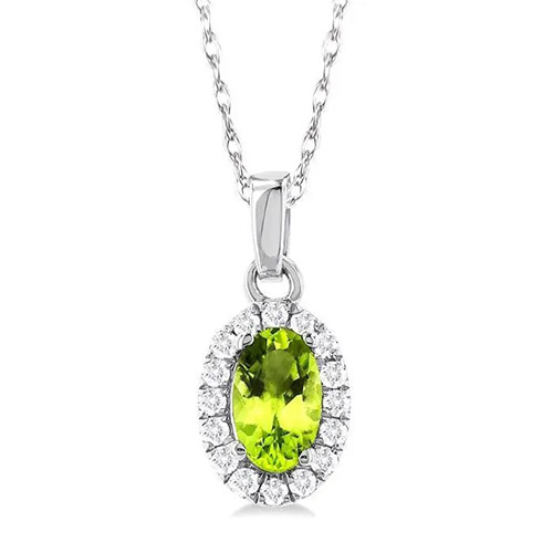 This one in particular has a resplendent peridot embellished with a halo setting of 16 circle cut diamonds. Fitted with 14-karat white gold it is also a durable and affordable peridot necklace for August birthdays.