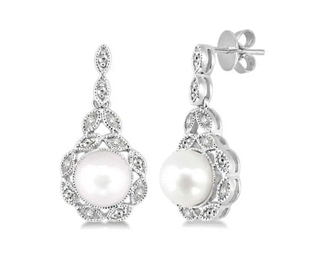 Do your bridesmaids and maid of honor deserve something that presents some pazzazz? More than just a traditional earring this piece features a fabulous floral-like lattice that is sure to amaze anyone. Wear this to any wedding or party and people will certainly be asking where you got it. This makes a great gift for those bridesmaids who love attention and luxury. Featuring cultured pearls, diamonds, and silver you get a wonderful trinity anyone would be happy to wear.