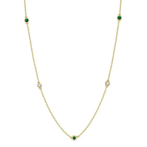 This delicate and graceful station necklace features the elegance of emeralds—the May birthstone—and the brilliance of diamonds. Spread evenly along a lovely 14-karat yellow gold chain, each emerald is set to shine its brightest against such a precious metal. With round-cut stones arranged to let every gem bask in its own stardom, this piece beautifully captures the spirit of individual beauty this May.