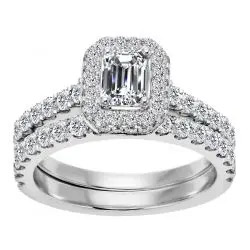 14k White Gold Emerald Cut Diamond Halo Engagement Set