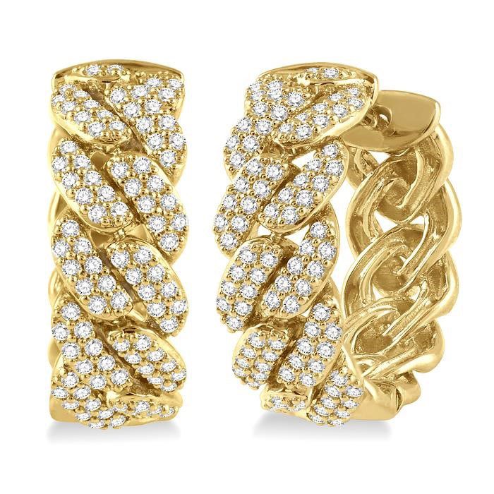 Cuban link jewelry offers splendor and is worthy of being envied. Having a couple of link jewelry, especially Cuban link in your jewelry case can help boost your style quotient. Try this stunning pair of Cuban link hoops, for a spectacular finish to your outfit. The earring features thick, closely knit links, which provide the hoops visual appeal. All links at the front are embellished with round cut diamonds. There is a total of 184 prong set round cut diamonds decorating the hoop, 92 diamonds on each hoop. The Cuban link hoop is molded in 14 karat yellow gold. The total diamond weight is 3/4 CTW.