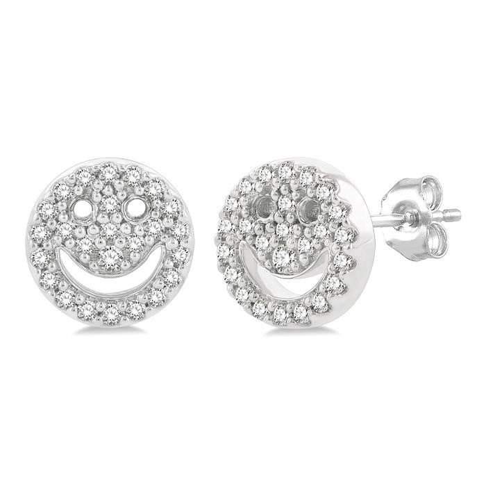 A smiley face is a symbol of positivity, optimism, happiness and peace. The smiley face has been around for over half a century and has had different connotations, but the basic representation has always been positive. The symbol has been used in various products including jewelry, which has found many takers for it through the years. This lovely pair of diamond smiley fashion stud earrings from the petite collection is a must-have. It is embellished with 50 prong set round cut diamonds, 25 each on the earring pair. The Petite smiley fashion earring is styled in a rhodium finish 10 karat white gold. The total diamond weight is 1/6 CTW.