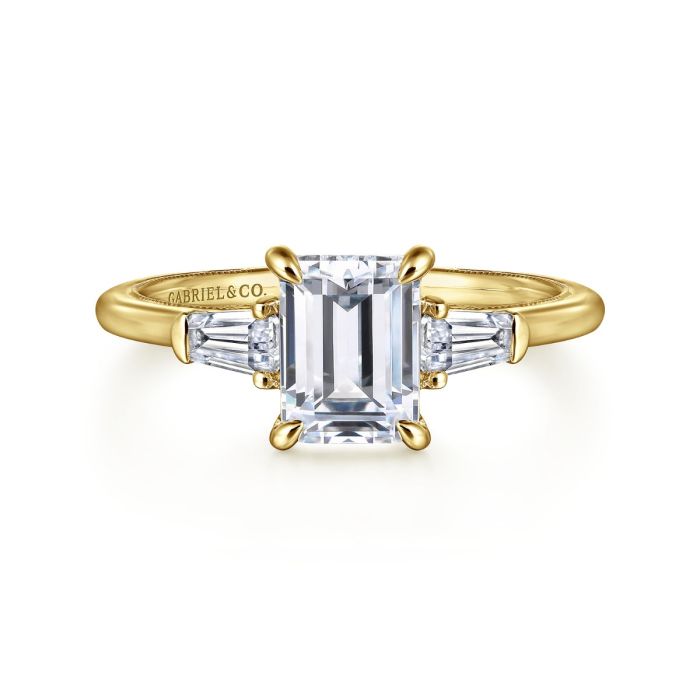 This exquisite semi-mount engagement ring is designed to complement your 1.5ct emerald-cut center stone, combining timeless elegance with a contemporary edge. Crafted in lustrous 14K yellow gold, this ring features tapered baguette side stones totaling 0.37 CTW, which gracefully flank the center setting. Milgrain detailing on the shank adds a vintage-inspired touch, while the sleek band ensures a sophisticated finish. Perfect for celebrating your unique love story, this setting is a radiant choice for any proposal.