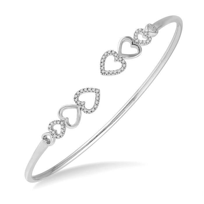 A chic, dainty diamond bangle, with an open center that allows it to fit different wrist sizes easily. The bracelet features a delicate heart charm arrangement, starting with a small heart charm and ascending in size to the largest at the top, on the open ends of the bangle. Two out of the four hearts on each end is embellished with round cut diamonds, while the other two remain in plain gold. There are 60 prong set round cut diamonds adorning the diamond stud hearts on either end. The flexi bangle is styled in 10 karat white gold. The total diamond weight is 1/4 Ctw.