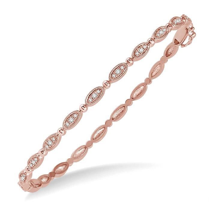 An alluring diamond stackable bangle, this makes for an instant attraction. Its impressive design does not fail to catch the eye. The bangle features oval shape mounts that smartly connect with each other via tiny ball links. Each of the oval mounts is then enhanced with round cut diamonds. A total of 35 pave set round cut diamonds embellish these oval mounts. The ball connectors are in plain gold. A bracelet catch with double security clasp secures the bangle, which is styled in 14 karat rose gold. The total diamond weight is 1/4 Ctw.