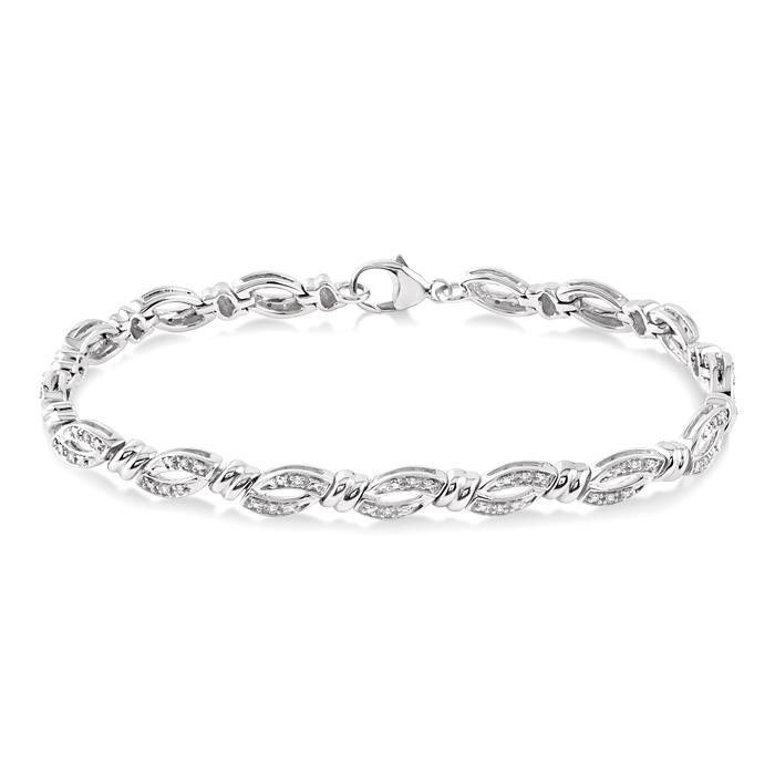 Tie your relationship into a knot of love with this Knot shape diamond bracelet. Fashioned on luminous sterling silver this bracelet is adorn with shimmering 30 single cut diamonds are set in a beautifully complementary knot shape motif. Diamonds are perfectly pave set. The total diamond weight is 1/6 Ctw. Fastens with a secure clasp.