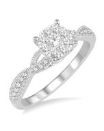 This is a mesmerizing Diamond Shine Bright Bridal Set with breathtaking beauty and stylish design. It comprises a 1/2 Ctw Engagement Ring with 31 round cut diamonds in invisible and prong setting and a 1/6 Ctw Wedding Band with 29 round cut pave set diamonds. Total diamonds in this beautiful set are 60. This set is made in 14 karat White Gold with milgrain finish. Total diamond weight is 5/8 Ctw.