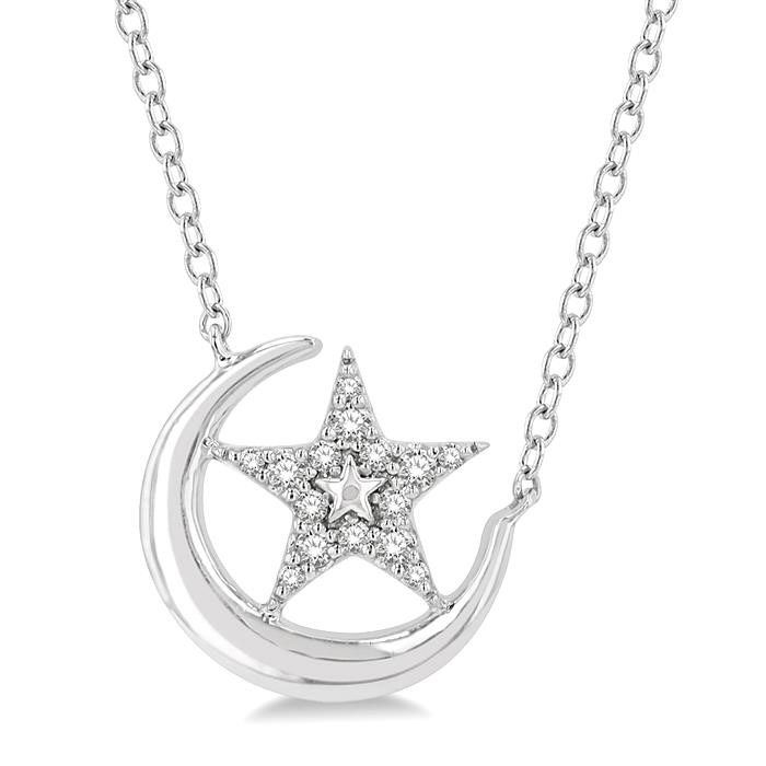 Halcyon Sovereign Crescent Moon & Star Petite Diamond Fashion Pendant pairs 10K White Gold with Diamond in a Pendant. Crafted for everyday elegance, it 1/10 CTW with clean lines. A versatile piece that layers well and suits Pendant looks. Balanced for day to night wear.