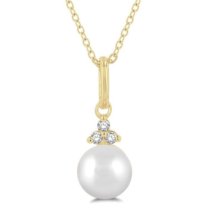 6 MM Round Shape Cultured Pearl and 1/50 CTW Round Cut Diamond Petite Fashion Pendant With Chain in 10K Yellow Gold