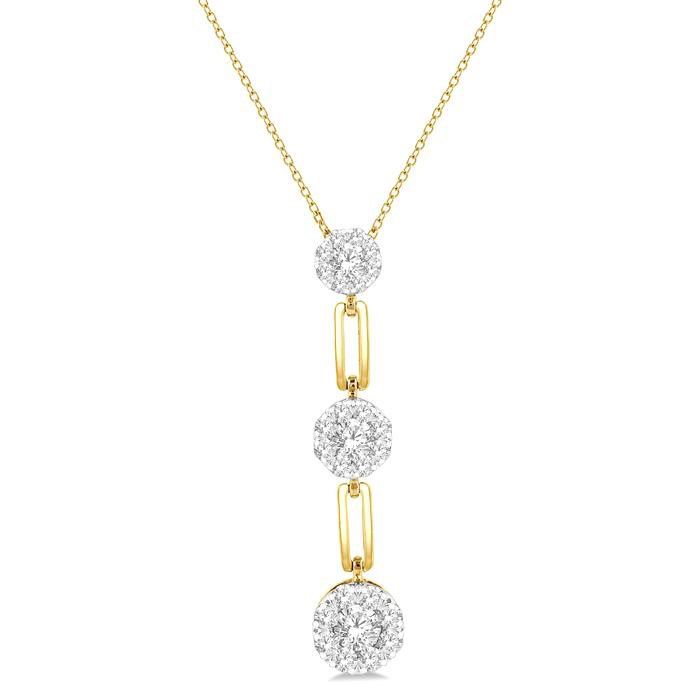 A collection to be envied, the Shine Bright assemblage is the kind of jewelry that every woman dreams of owning. This enchanting Shine Bright diamond pendant proves that the collection is truly desirable. It features three 14 karat white gold round mounts in three sizes, the smallest at the top and the largest at the bottom. The mounts are linked via two plain gold paper links and are embellished with 9 each invisible set round cut diamonds, one in the center and 8 haloing it, total 27 diamonds. An 18-inch 14 karat yellow gold cat chain carries the Shine Bright pendant, which is styled in 14 karat yellow and white gold. Total diamond weight is 1/2 CTW.