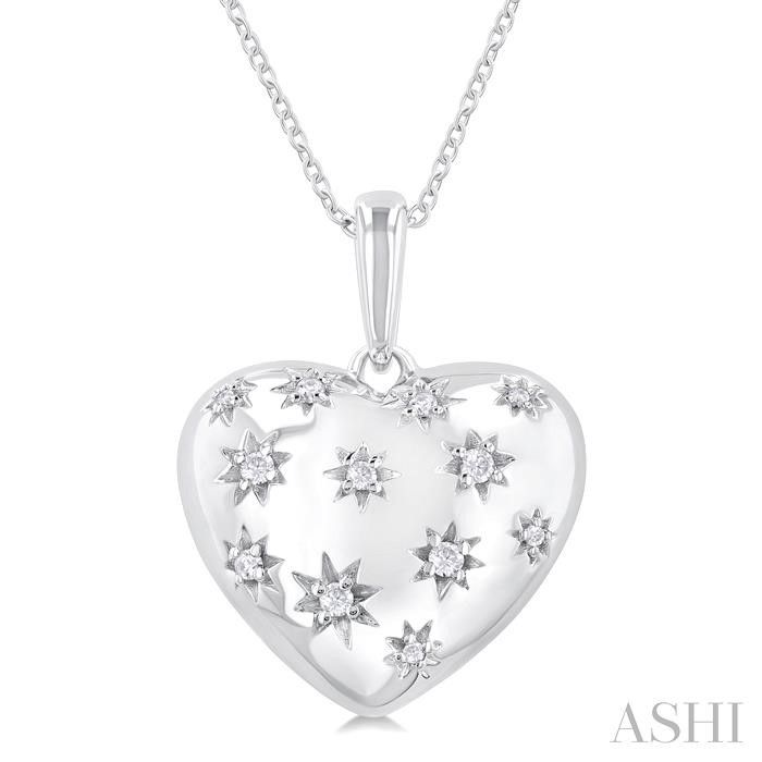 The heart, a timeless symbol of love and affection, represents deep emotional connections, making heart-shaped jewelry a meaningful gift for expressing love, passion, and devotion. This bold diamond heart pendant serves as a lovely reminder of heartfelt bonds and cherished relationships. It features a beautiful puffed heart adorned with 12 intricately carved star-shaped designs. Each star carving is set with a sparkling prong set round cut diamond, adding a touch of brilliance. A sleek sterling silver loop holder connects the pendant to a cable chain, offering a refined and elegant look. Both the pendant and chain are styled in rhodium finish sterling silver. The total diamond weight is 1/10 CTW.