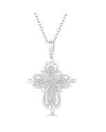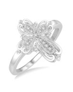 Symbolize your expression of religious devotion with these magnificent diamond cross earrings. Fashioned in sterling silver, these milgrain finish earrings are embellished with 12 radiant pave set round cut diamond. These treats closed with secure clasp. The total diamond weight is 1/20 CTW.