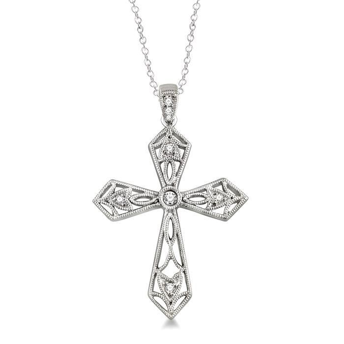 Symbolize your power expression of religious devotion with this magnificent diamond cross pendant. Fashioned in sparkling sterling silver, this ravishing pendant is embellished with 8 radiant bezel and prong set single cut diamond and hangs from a Cable chain. The total diamond weight is 1/20 CTW.