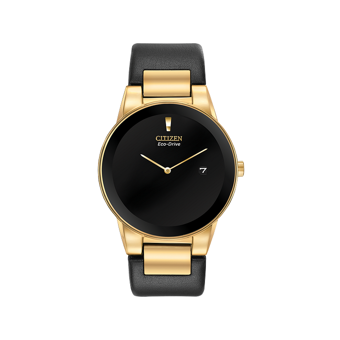 Axiom's refined yet sleek design offers a day-to-night fashion options for the avid trendsetter. A watch with CITIZEN's Eco-Drive technology, not just a solar watch, but powered by any light, featured in a men's gold-tone stainless steel case, black leather strap with black dial and the intriguing feature of edge-to-edge glass. Caliber number J165.