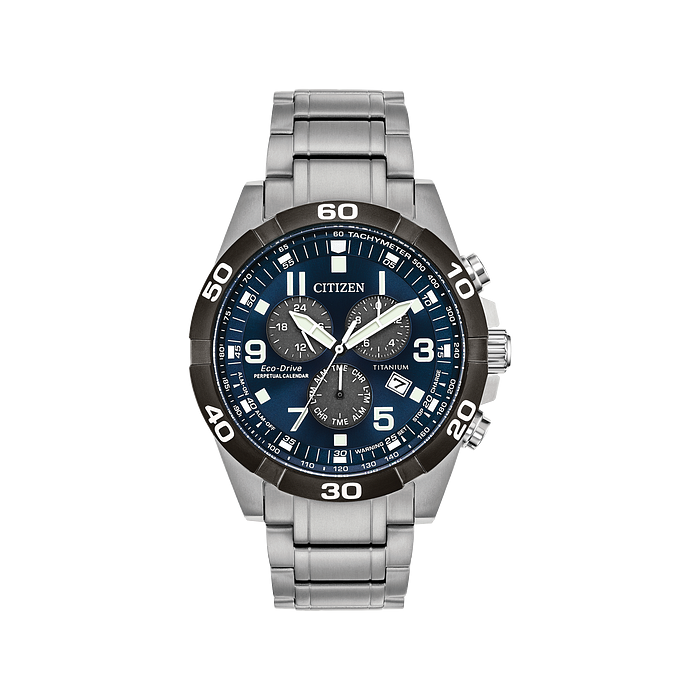 Take things up a notch with this Super Titanium™ CITIZEN Brycen timepiece. Includes a 1/20 second chronograph up to 60 minutes, 12/24 hour time, perpetual calendar, dual time, tachymeter, date and alarm. The Super Titanium™ case and bracelet is completed with a midnight blue dial. Featuring our Eco-Drive technology – powered by light, any light. Never needs a battery. Caliber number E820.