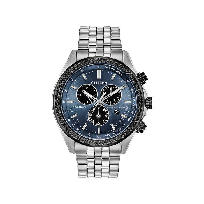 Taking it up a notch with the reinvented Citizen Perpetual Calendar Chrono timepiece with a 1/20 second chronograph, perpetual calendar and dual time in a stainless steel case and bracelet completed with a blue-gray dial. Featuring our Eco-Drive technology – powered by light, any light. Never needs a battery. Caliber number E820.