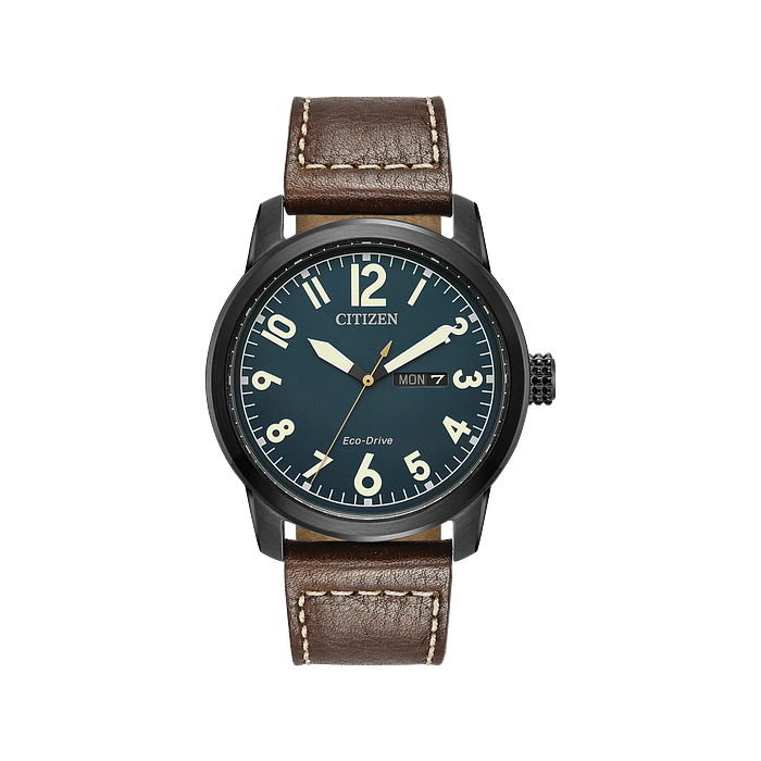 With a rich leather strap, this Citizen military inspired timepiece is polished and comfortable. Chandler, featured here in a black ion plated stainless steel case, dark brown strap with contrast stitching and dark blue dial. Added features include day and date. Featuring our Eco-Drive technology – powered by light, any light. Never needs a battery. Caliber number E101.
