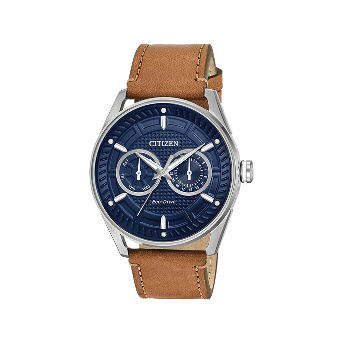 The Drive from Citizen collection. A collection of watches with simple classically modern design, all powered by Eco-Drive Technology. Watches powered by any light and never need a battery change. Featured here in stainless steel case, caramel brown leather strap with a navy blue dial, day and date. Featuring our Eco-Drive technology – powered by light, any light. Never needs a battery. Caliber number 8725.