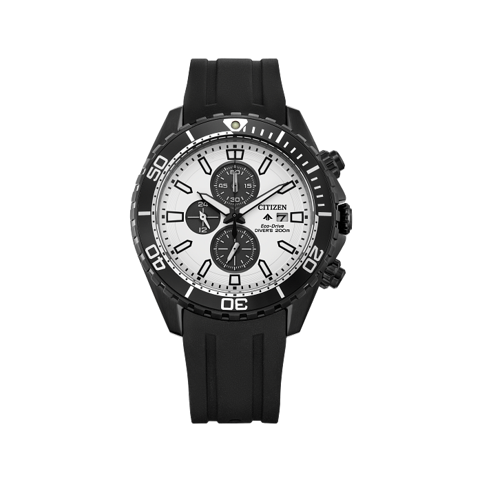 Explore the deepest depths of style with Citizen’s Promaster Eco-Drive Dive watch. Featuring a silver-tone stainless steel case and black polyurethane strap with white dial and luminous hands and markers, this must-have dive watch also includes a 1/5 second chronograph measuring up to 60 minutes, 12/24-hour time and date function. Sustainably powered by any light with Citizen’s Eco-Drive technology that never needs a battery, you’ll wear this high-performance timepiece in high style from adventures on land to the deep blue sea. Caliber number B612.