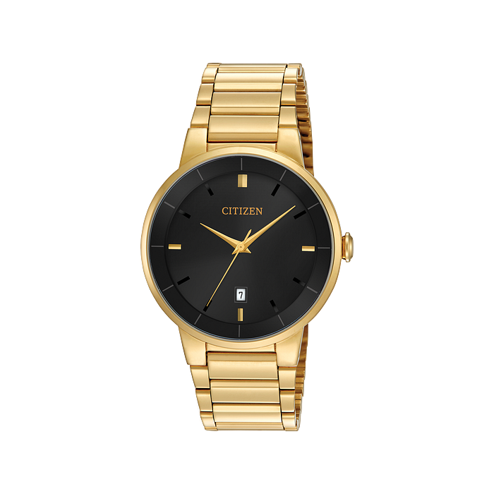 Men's Quartz gold-tone stainless steel case and bracelet with black dial and date feature.