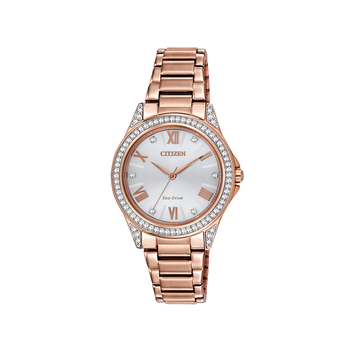 Share your fashionable point of view starting with this hip watch with 64 crystals on the pink gold-tone stainless steel case. A sleek pink gold-tone stainless steel bracelet and a silver dial dotted with 6 crystals. Featuring our Eco-Drive technology – powered by light, any light. Never needs a battery. Caliber number E031.