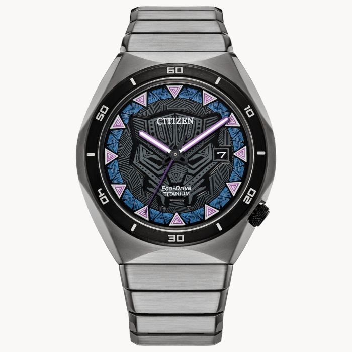 The silver-tone Super Titanium™ case features a gray resin stamped bezel and a black 3-hand dial with date that is finished with a sapphire crystal and showcases the Black Panther patterned icon under luminous hands and markers. The silver-tone Super Titanium™ bracelet fastens with a fold-over clasp and push buttons. The case back further emphasizes the majesty of T’Challa with the engraving, “Wakanda Forever.” The special packaging includes a Marvel collector’s card illustrating the Black Panther’s superhuman power in his Wakandan Vibranium suit that is strong and lightweight, just like Citizen’s proprietary Super Titanium™ technology. This exceptional watch is powered by light with Eco-Drive and never needs a battery.
