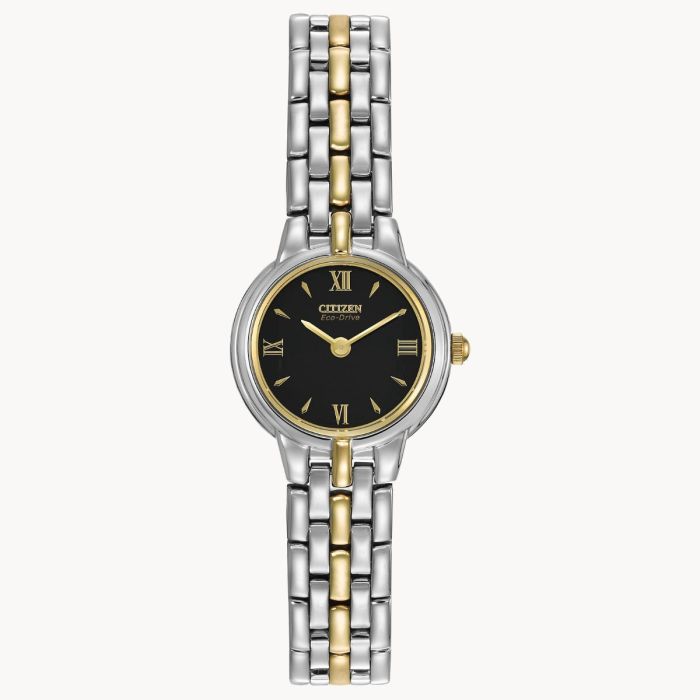 A sporty look for day or night, this Silhouette model in stainless steel two-tone with black dial complements any look.
