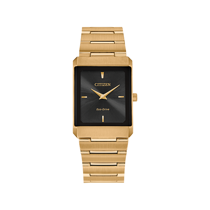 For a bold style, the Stiletto from Citizen is perfect for both men and women with a gold-tone stainless steel bracelet and case, and a sleek black face with a gold-tone two-hand dial. It is just 5.06mm (+/- .25mm) thick, taking advantage of our long history designing elegant, slim timepieces. It is also powered by Eco-Drive technology, so it will always be ready to go when you are.