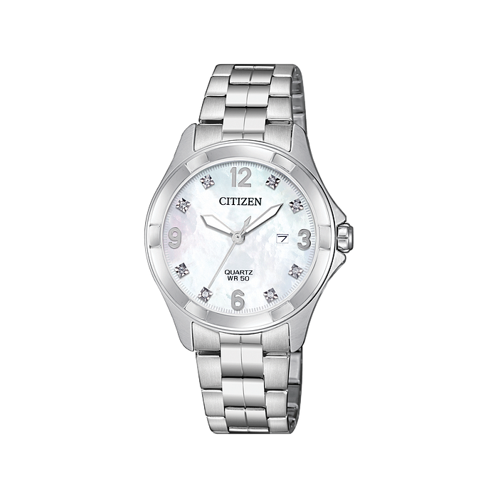 The Quartz from citizen is a silver watch designed for ladies, with a striking mother-of-pearl dial and eight crystals for a luxury look and feel. This unique watch features a stainless steel case with a snap-on back perfect for engraving, paired with a stainless steel bracelet watch band. It has luminous silver-tone minute and hour hands, and a silver-tone second hand, as well as displaying the current date. It is a striking timepiece that will compliment every style and outfit, and is sure to be a favorite in every watch collection.