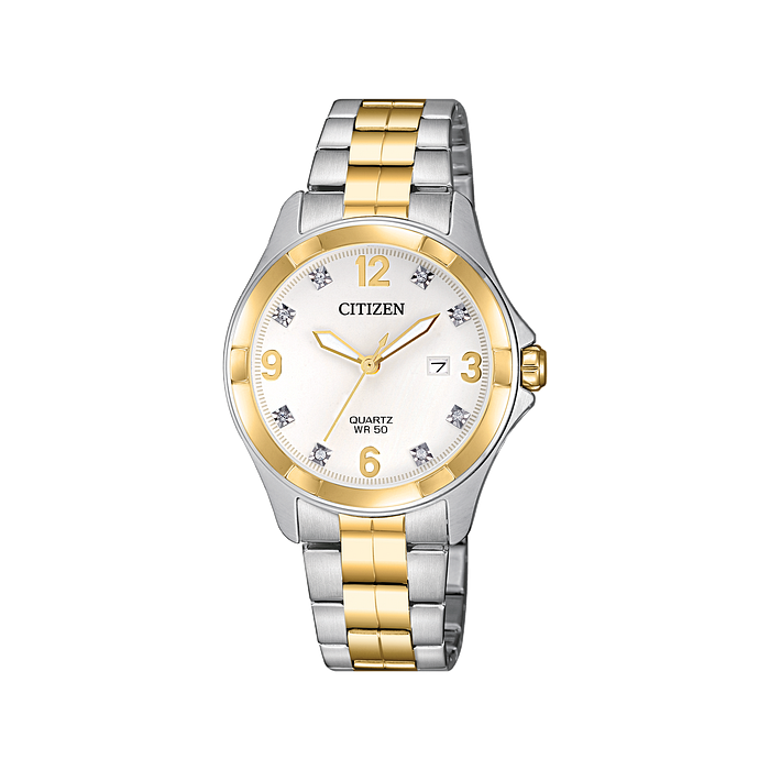 The Ladies Quartz watch from Citizen is a battery-operated timepiece with a stainless steel two-tone case, and a silver-white dial inset with eight crystals. It is paired with a two-tone stainless steel bracelet watch band and features luminous gold-tone hour and minute hands, as well as a gold-tone second hand. The stainless steel snap-on case back is perfect for engraving, making it an excellent gift for the discerning woman in your life.