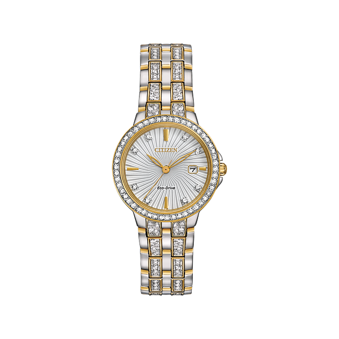 Classic lines and fashionable edge with lots of sparkle are hallmarks of this Citizen Silhouette Crystal two-tone stainless steel bracelet. Featuring a two-tone accented dial, bright crystals and date feature. Featuring our Eco-Drive technology – powered by light, any light. Never needs a battery. Caliber number E013.