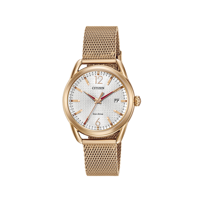 Make room in your watch collection for the new Drive from Citizen timepieces. A fresh staple to your every day watch wearing with clean lines and simplistic detailing that is powered by the light around you with Eco-Drive technology. Featured here in a rose gold-tone stainless steel case, rose gold-tone stainless steel Milanese mesh bracelet, silver-tone dial and rose gold-tone accents.Featuring our Eco-Drive technology – powered by light, any light. Never needs a battery. Caliber number J810.