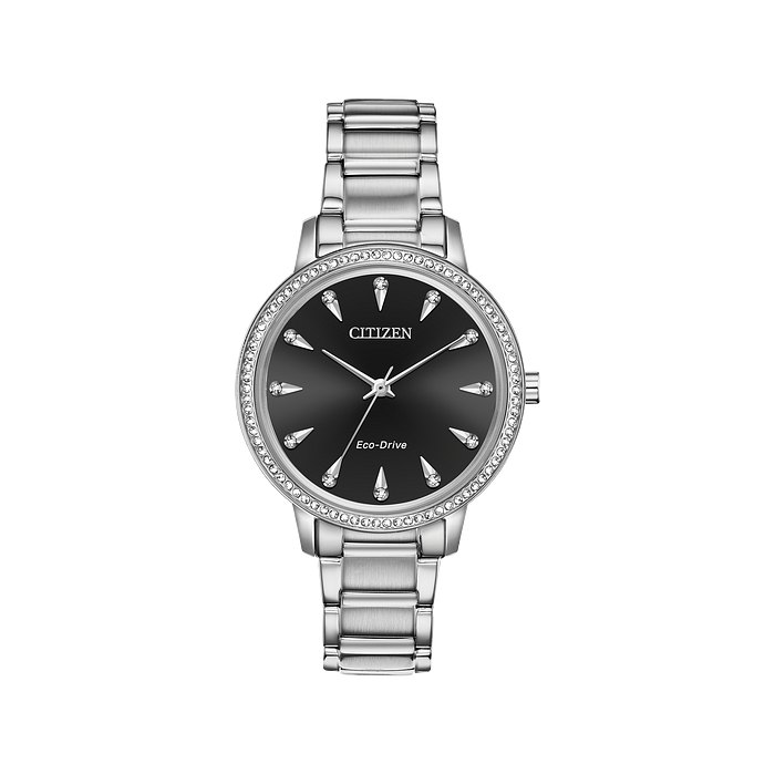 Citizen Silhouette Crystal, fashionable, precise and powered by light, creates an appeal unlike any other decorated with crystals. Featured in stainless steel with a contrasting black dial. Featuring our Eco-Drive technology – powered by light, any light. Never needs a battery. Caliber number J830.